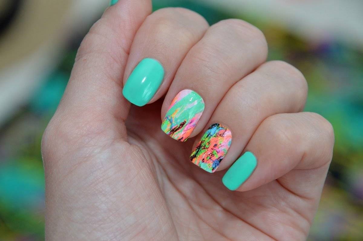 Мятный цвет в неоновом маникюре, покрытый матовой текстурой, смотрится на ноготках свежо и при этом легко. В осенний период, отдавайте предпочтение теплым цветам, таким как: хаки, золотой, желтый с тематическими осенними рисунками и принтами. Такой маникюр мастера нейл-арта украшают фольгой, нюдовым дополнением.