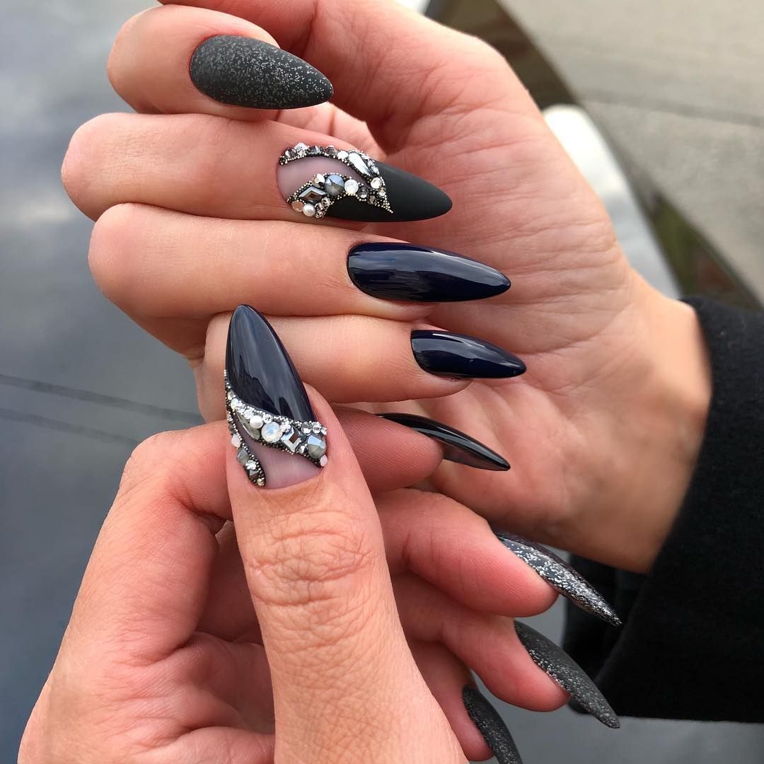 Королева бьюти-тенденций, Кайли Дженнер, буквально несколько месяцев назад активно начала появляться в соц. сетях с ярко-черным блестящим маникюром заостренной миндалевидной формы. В ее случае это смотрится стильно и свежо, с нотками вамп-стиля.