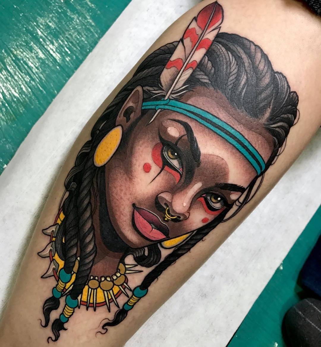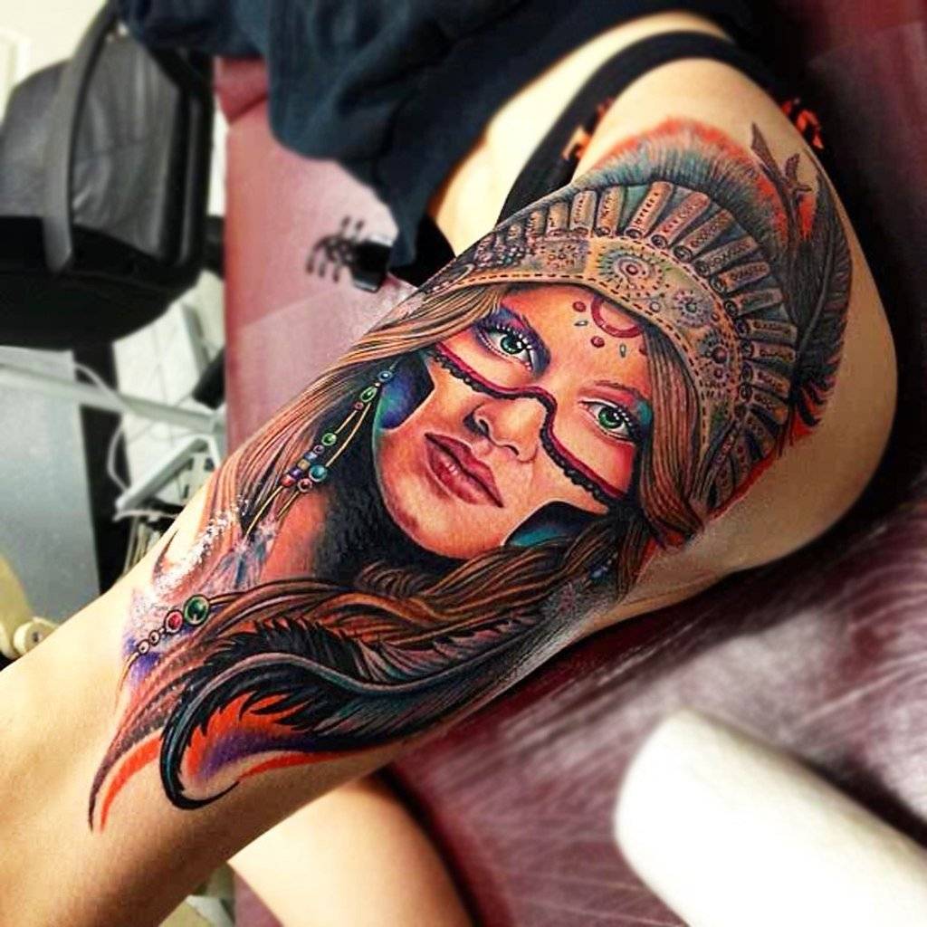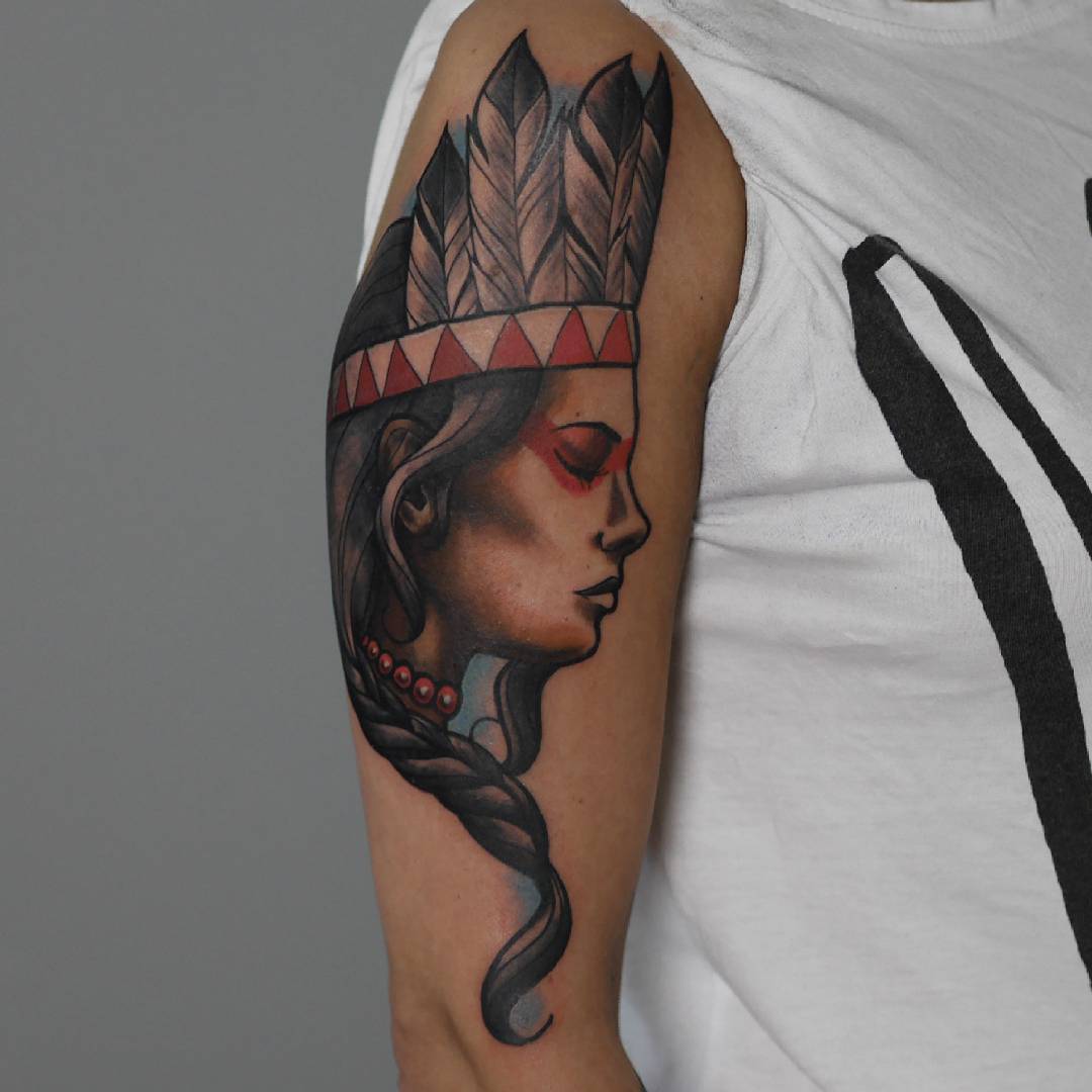 Тату с индейской девушкой раньше являлась знаком того, что девушка хочет заручиться поддержкой древних духов в любовных вопросах. Согласно обычаю, духи оберегают девушку от бесчестных и подлых молодых людей, защищая ее честь и благородство. Данная идея имеет актуальность и в наши дни, но чаще всего тату такого типа создается для красоты.