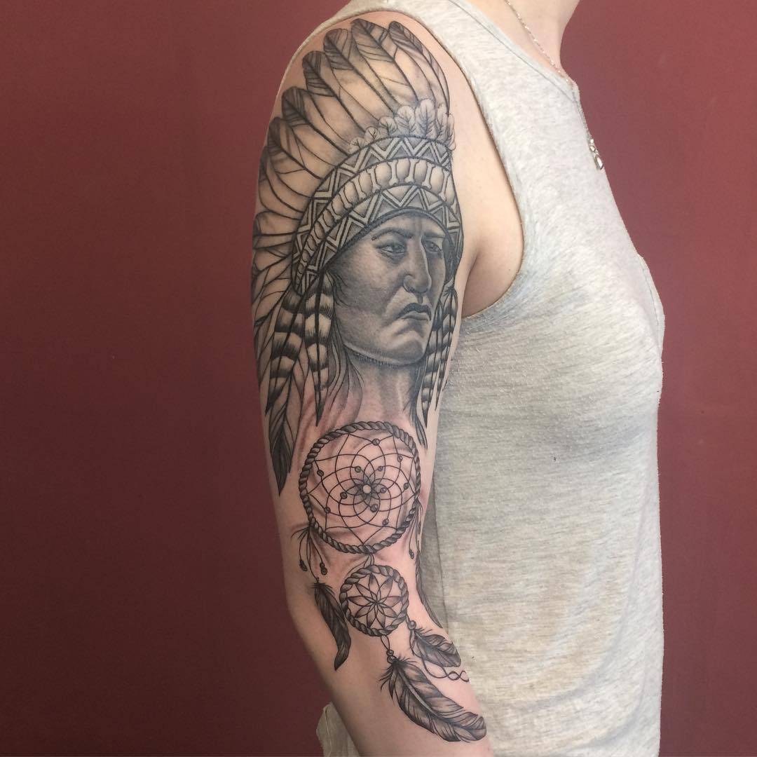 Татуировка с первым обитателем Северной Америки символизирует почитание традиций и уважение к предкам. Обладатели такого нательного рисунка придерживаются идеологии о том, что наука и технологии разрушают связь человека со своим природным началом и духовностью. Индеец, как древний житель, олицетворяет могущество, способность самостоятельно справляться с жизненными трудностями и взаимодействовать со стихиями Вселенной.