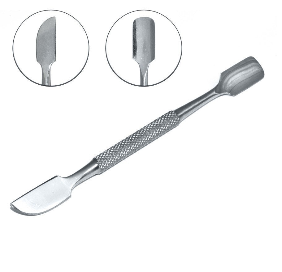 Пушер (шабер) – это маникюрный инструмент в форме лопатки с одной стороны и оснащённый топориком или шпателем с другой стороны. Он помогает отодвинуть кутикулу и отчистить отмершие частицы кожи от ногтевого ложа.
