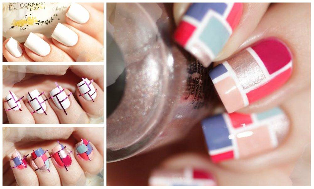 Любительницы чистых оттенков оценят сочетание кофейного, нежно-бежевого и темно-коричневого цветов. Чтобы повторить этот дизайн вам потребуется обычный канцелярский скотч, все остальные материалы те же, что и в предыдущих мастер-классах. Схема такая: