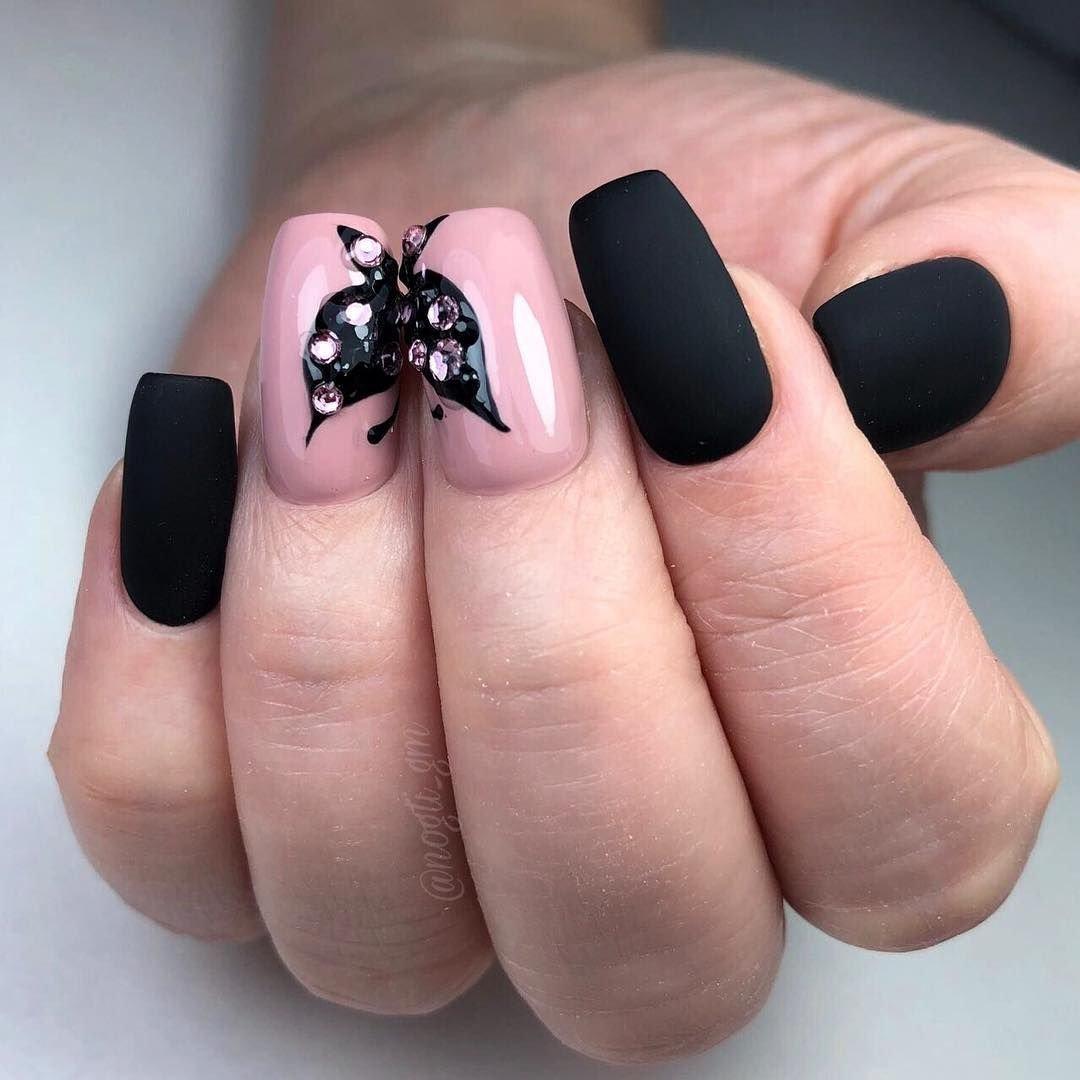Бабочки, цвет крыльев которых перекликается с оттенком других ногтей. Если вы решили сделать маникюр с бабочкой на одном ногте, попросите мастера использовать такой прием. К примеру, 4 ногтя одной руки могут быть окрашены в мятный оттенок. Ноготь безымянного пальца остается бесцветным. На него мастер наносит изображение бабочки, крылья которой выполнены в том же мятном цвете. Насекомое обязательно очерчивают чёрным или белым контуром. При необходимости дополняют стразами. Играть можно с любыми желаемыми оттенками.