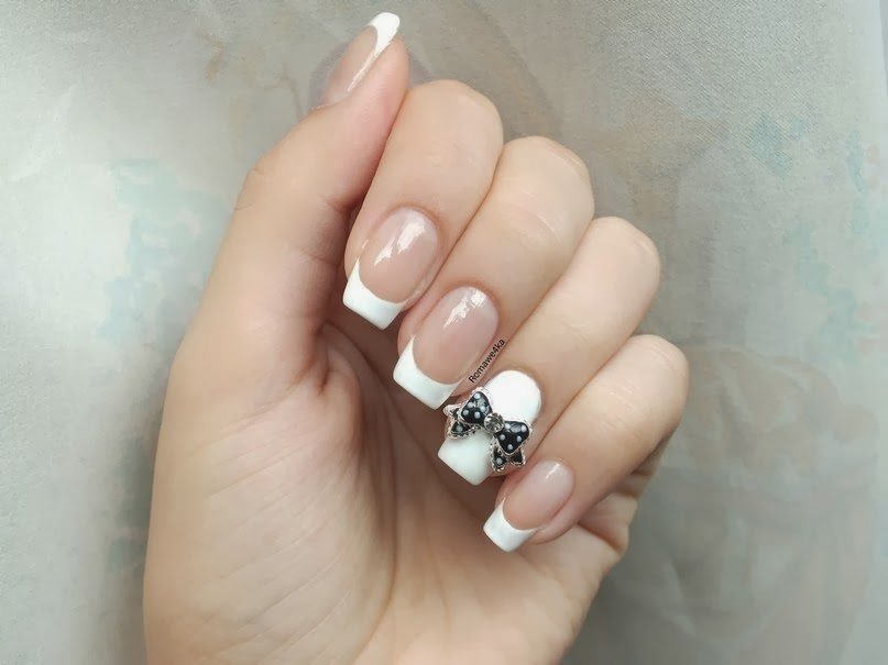 Французский маникюр подразумевает безупречную четкость линий, поэтому, если вы хотите украсить его бантиками, но они у вас получаются не очень хорошо – воспользуйтесь специальными трафаретами для дизайна, которые можно приобрести в любом специализированном магазине. Также существуют наклейки-бантики, которые можно использовать вместо рисунков – они стоят недорого и очень просты в использовании.