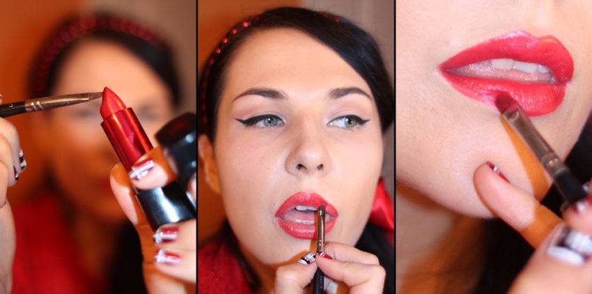 При нанесении сильно ярких цветов используйте кисточку для нанесения помады. Обязательно должен быть хороший свет, чтобы вы могли точно прокрасить губы и не выйти за их контур.