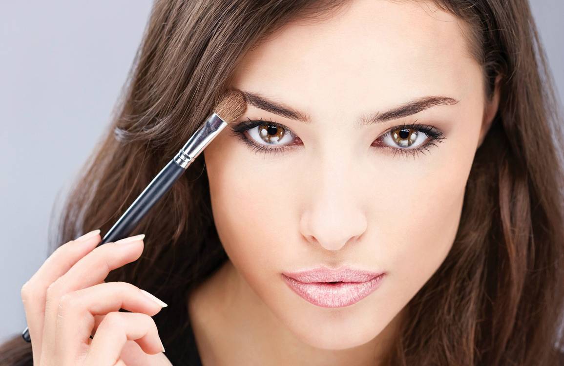 - Светло-бежевые оттенки накладываются под бровь, а светлый тон используется в качестве основы под тени. Края теней следует растушевать. Более темные оттенки располагают у внешнего края века и выводятся на границу подвижного века.