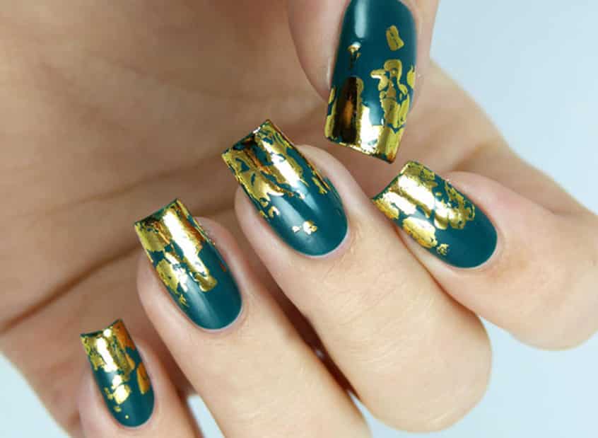 Дизайн ногтей с кусочками золотой фольги.