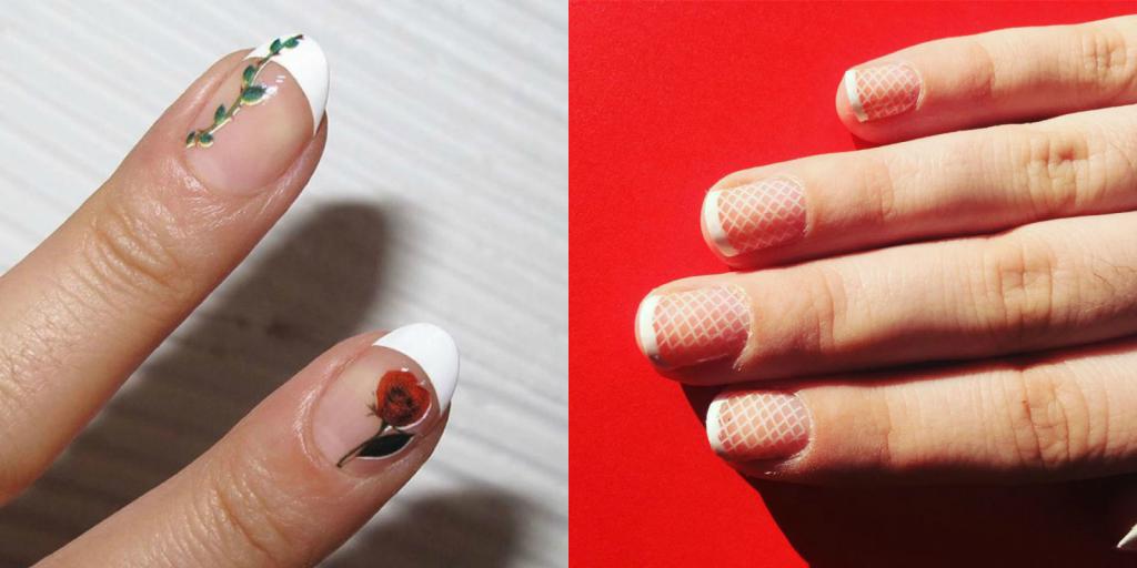 Наклейки — простейший способ дизайна. В современных магазинах можно найти огромное количество блоков с переводными рисунками разного типа. Дополнить французский маникюр таким дизайном можно и дома.