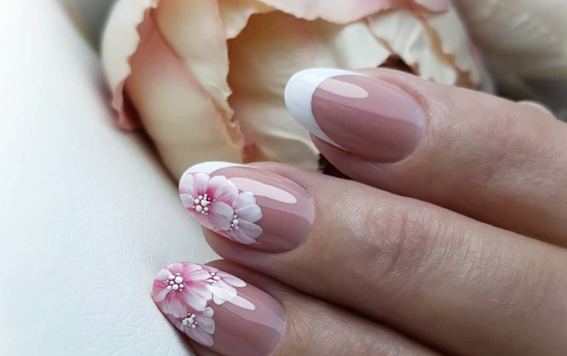 Первым изменением, которое коснулось французского маникюра, стали цветочки на безымянном пальчике. Рисовать их можно поверх основного фона, на френч «залезть» тоже никто не запрещает. Но здесь опять все зависит от ваших предпочтений. Можно выделить рисунком один ноготь, а можно нанести на все. Как вариант – половинки цветочков по краям ногтевой пластины.