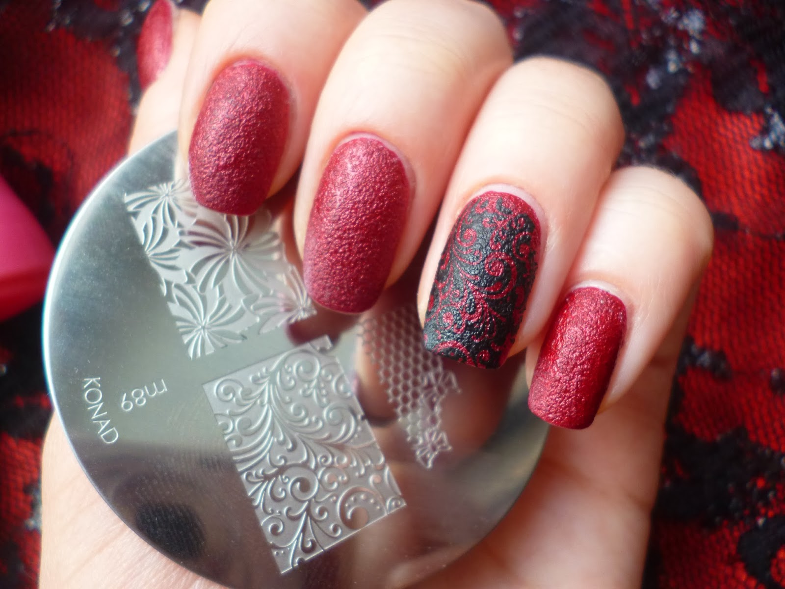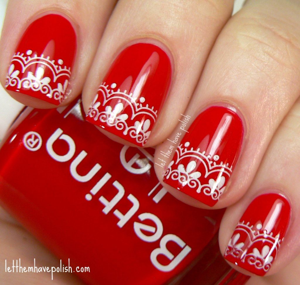 Такой маникюр обязательно привлечет внимание. На красном фоне отлично будет смотреться белое или черное кружево, хотя в зависимости от образа могут использоваться и другие оттенки