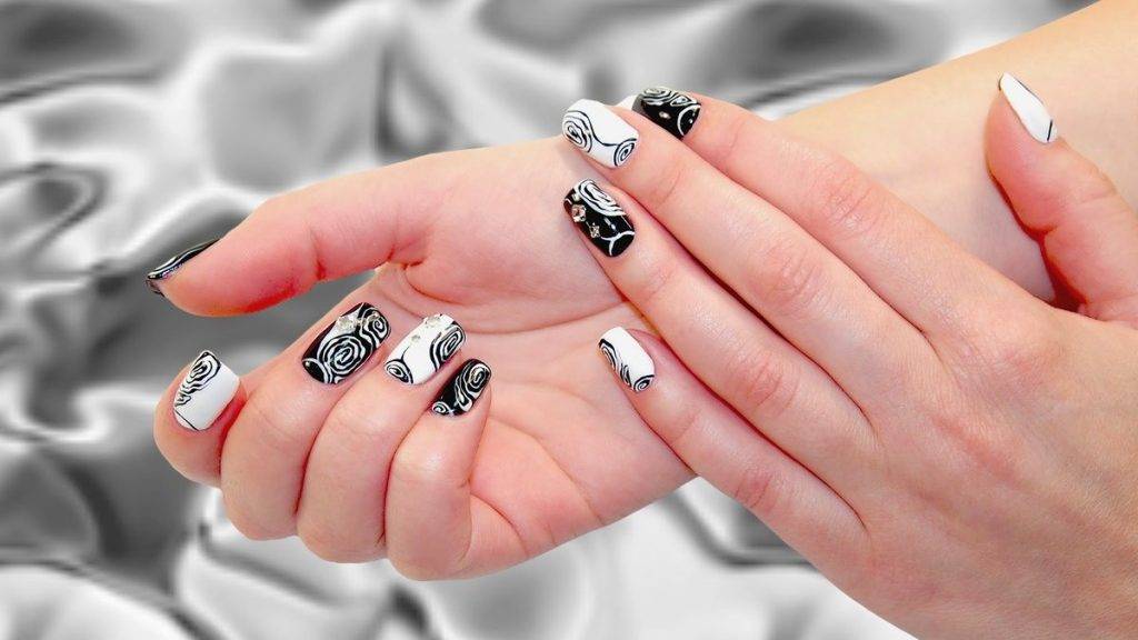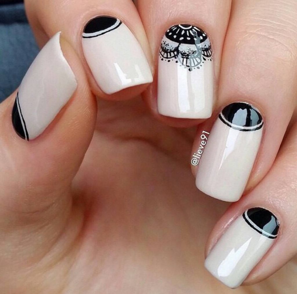 Сочетание черного и белого смотрится очень привлекательно и элегантно. К тому же такой маникюр подходит под любой наряд.