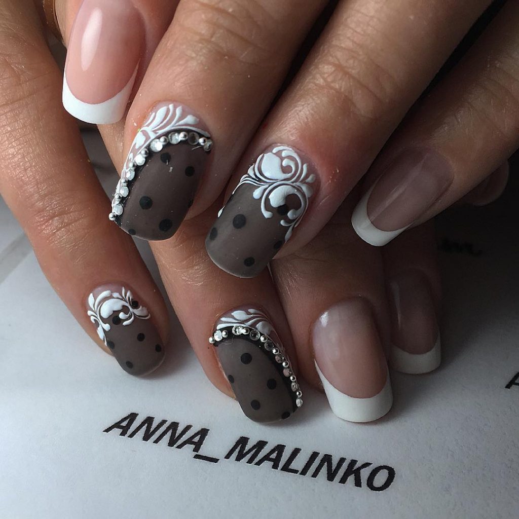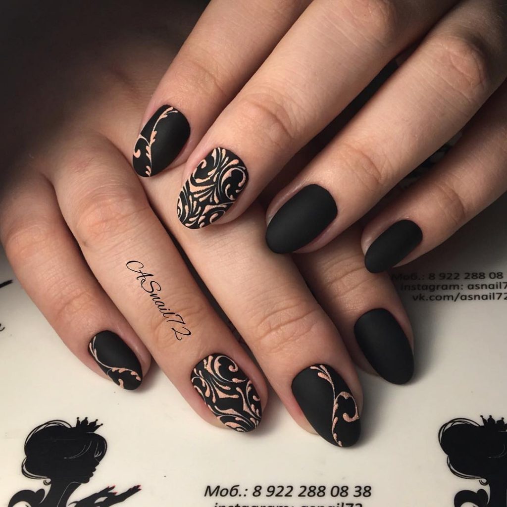 Безупречный вкус можно подчеркнуть маникюром, в котором черное кружево покрыто бежевым матовым покрытием. Такой дизайн будет уместен как на праздничном мероприятии, так и в повседневной жизни.