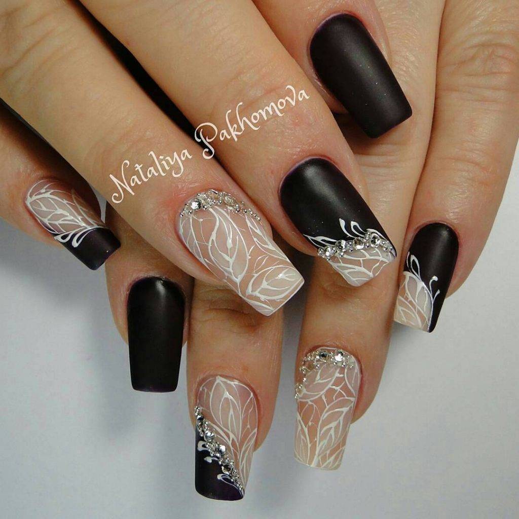 К числу самых популярных вариантов кружевного маникюра дизайнеры относят полупрозрачную черную вуаль с мелкими белыми вкраплениями. Для девушек с шикарными длинными ногтями лучше всего делать черное кружево с нежным дымчатым переходом.