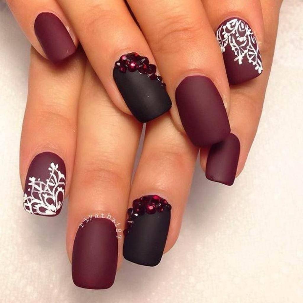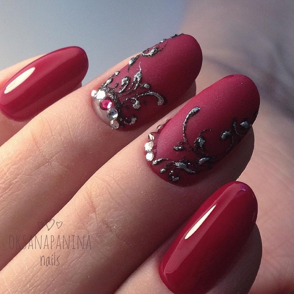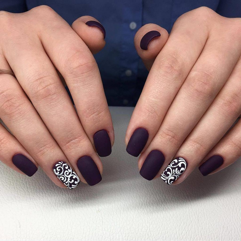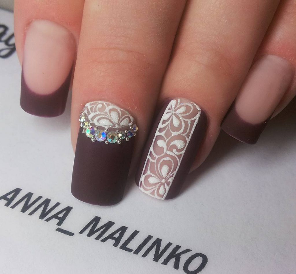 Кружево невероятно шикарно смотрится на матовой поверхности. Для этого ногти окрашиваются матовым лаком, после чего обычным лаком на поверхности наносится ажурный узор. Такой маникюр можно выполнить в одном цвете или с использованием контрастных оттенков. При этом лучше всего он будет смотреться в насыщенных темных оттенках.