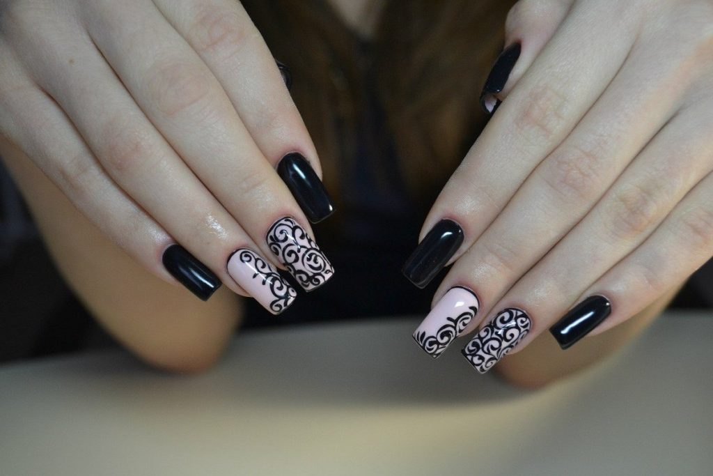 Ногти с темным ажурным рисунком – второй по популярности нейл-тренд. Соблазнительные узоры при этом выполняются в сине-черных, сиреневых, пурпурных, бордовых тонах. В основе такого дизайна обычно используются цвета, контрастные кружевному рисунку: белый, сливочный, серый, серебристый или смежные по палитре – темно-розовый, лиловый, голубой. Несколько экстравагантных идей изображено на фото.
