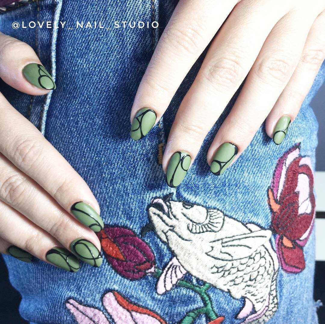 Матовый маникюр с глянцевым рисунком. Фон оттеняет красоту и глянец рисунка.