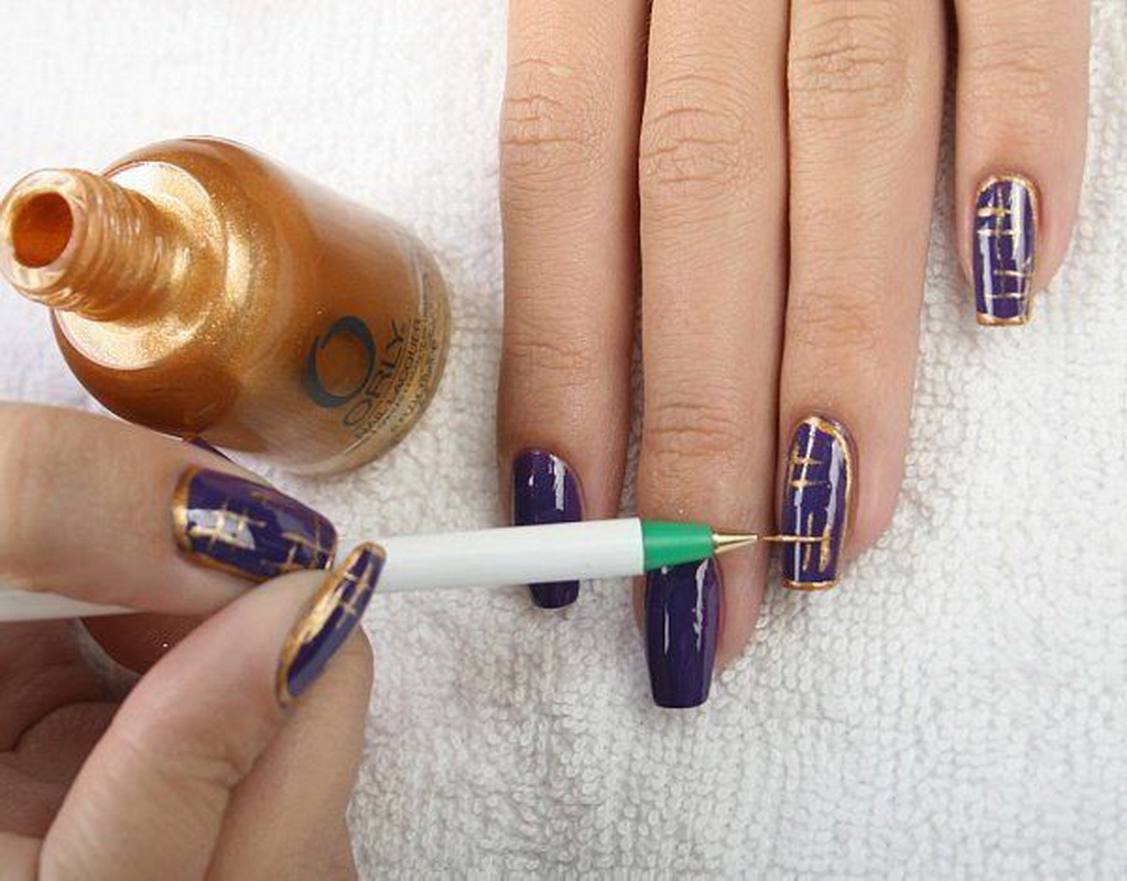 - Золотым цветом покрытия, выполните нанесения трех полосок, с каждой краевой стороны ногтя.