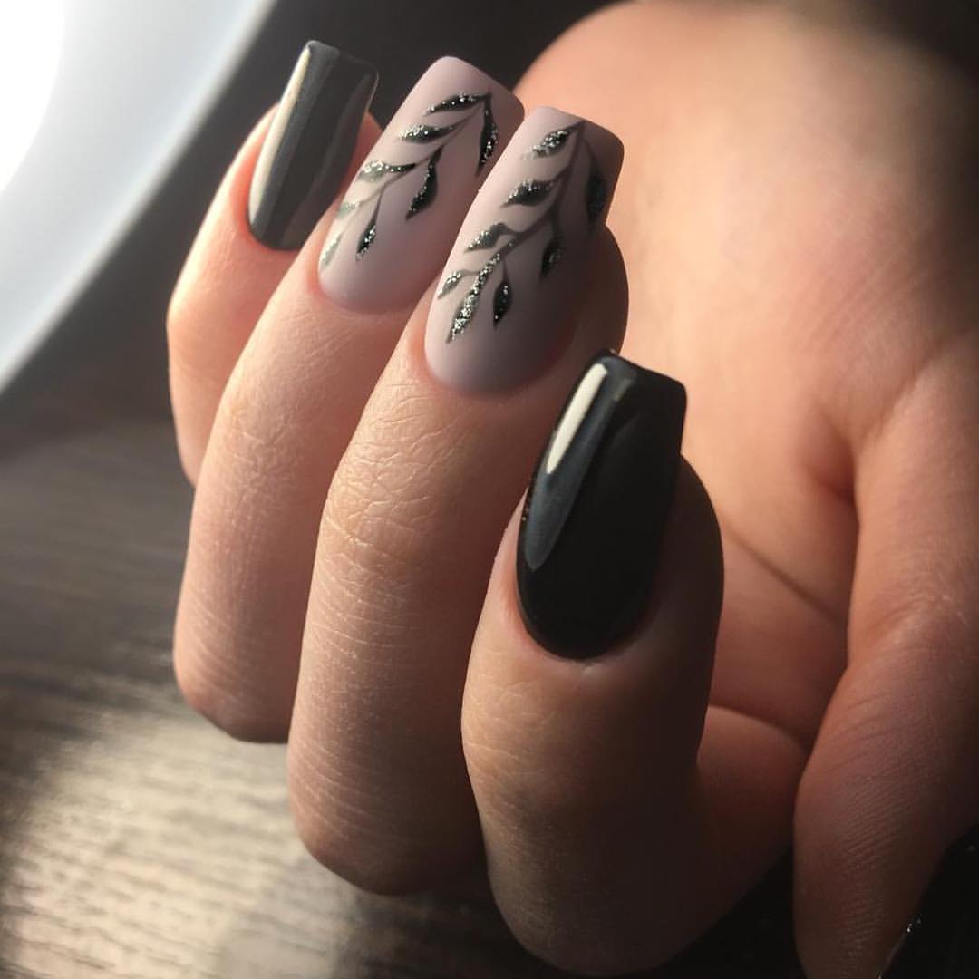 При его создании можно задействовать оттенки с перламутровым переливом или дополнить его блестками. Самый универсальный маникюр – «черный мрамор», который подходит под все наряды.