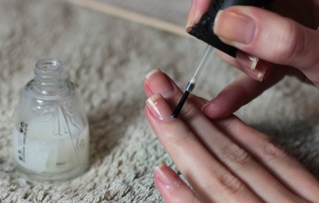 Сначала на ноготь наносится базовое покрытие. Это делается для того, чтобы защитить ноготь от цветного пигмента для облегчения снятия покрытия, а так же для увеличения прочности покрытия и более равномерного нанесения цвета.