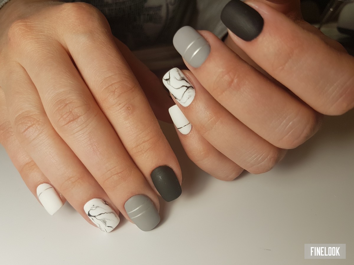 Этот маникюр оценят любительницы минимализма. Маникюр повторяющий прожилки благородного камня уже почти-что стал классикой.