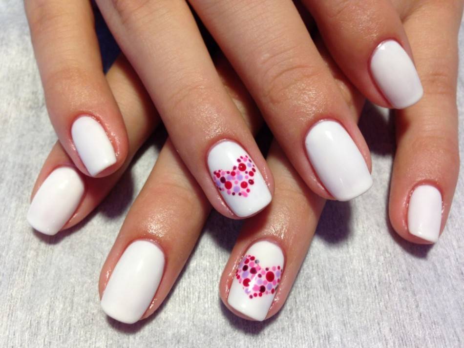 Возьмите два лака: красного и белого цвета. Покрасьте все ногти красным лаком, а безымянный — белым. На нем нарисуйте сердечко красным лаком. Форму и размер можете выбрать разнообразные, к примеру, нарисуйте сердце в уголке ногтя, или нарисуйте миниатюрное сердечко, расположенное внизу ногтевой пластины.