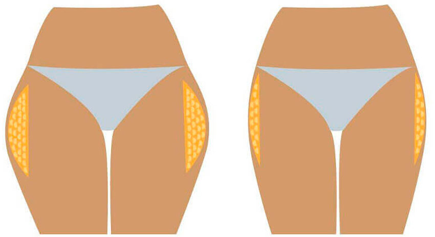 Образования жира на бедрах могут достигать внушительных размеров, поэтому и получили название галифе или «ушки».