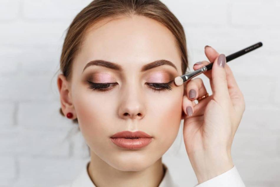 - Светло-бежевые оттенки накладываются под бровь, а светлый тон используется в качестве основы под тени. Края теней следует растушевать. Более темные оттенки располагают у внешнего края века и выводятся на границу подвижного века.