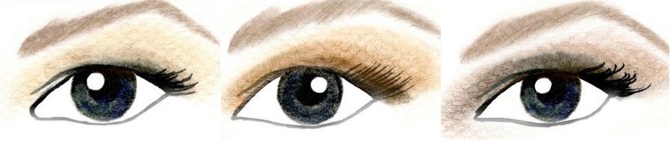 Основной участок окрашивается в нюдовый оттенок. Край ресниц необходимо прорисовать темным карандашом и затем растушевать. Средний цветовой оттенок очертит подвижное веко и «подводится» к бровям. Нижний край глаза покрывается средней цветовой палитрой, соединяясь с ним же, но нанесенным на верхнюю часть глаза.