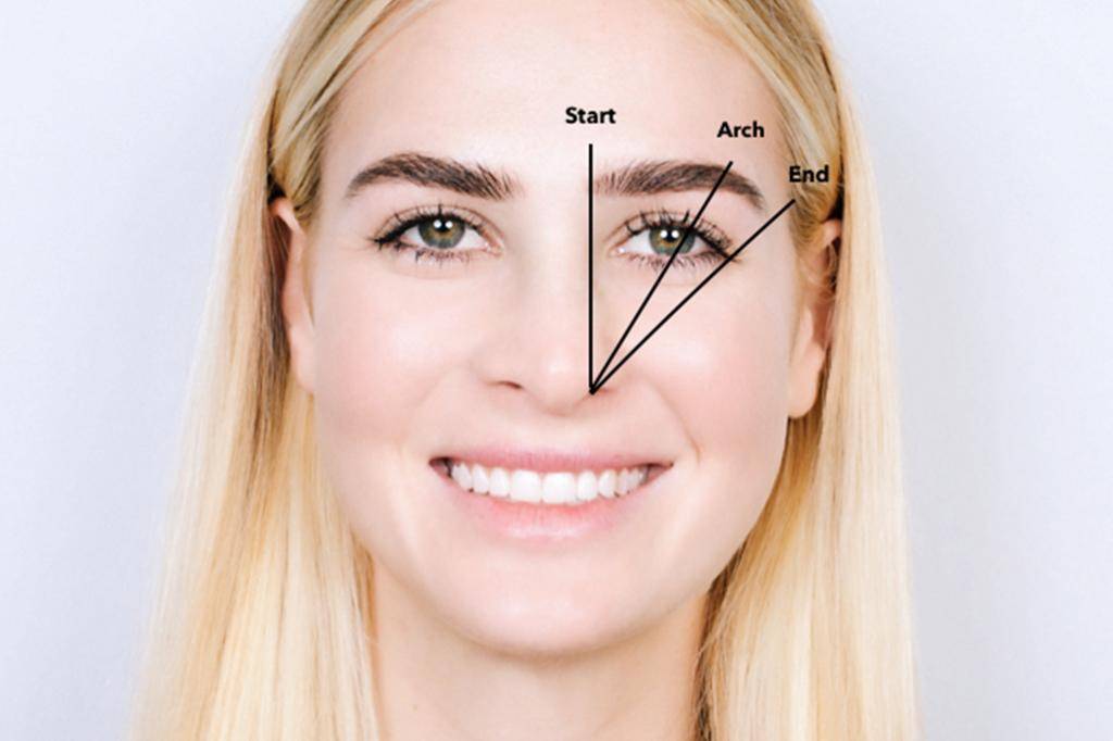 - Определить место, где заканчивается бровь, очень просто. Проведите прямую линию от края носа через внешний край глаза.