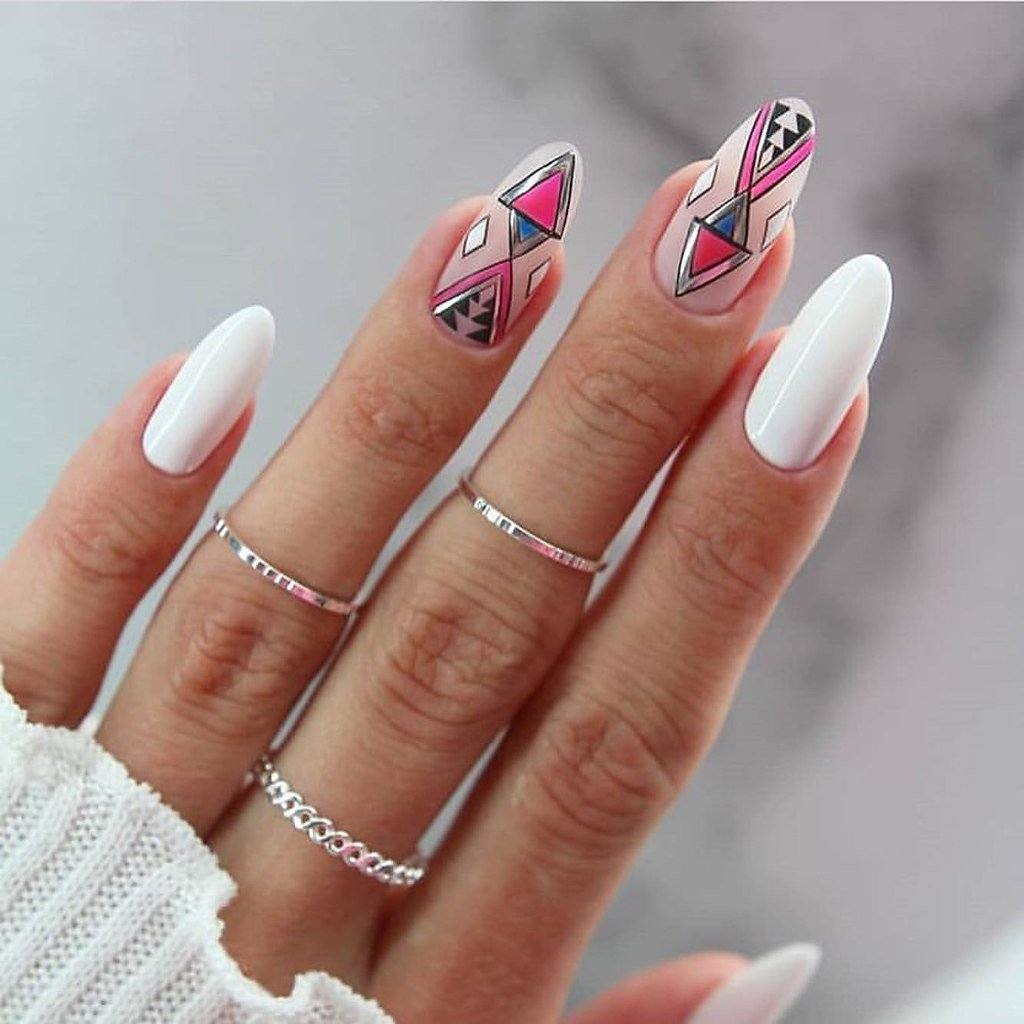 Модная тенденция с геометрическими рисунками и принтами просматривается не только в одежде, но и в нейл-арте. Главная привлекательность этих дизайнов в том, что они делаются довольно таки просто, но при этом, выглядят очень эффектно. К тому же, в зависимости от рисунка, вы можете визуально скорректировать форму ноготков, сделав их более вытянутыми или, например, узкими.