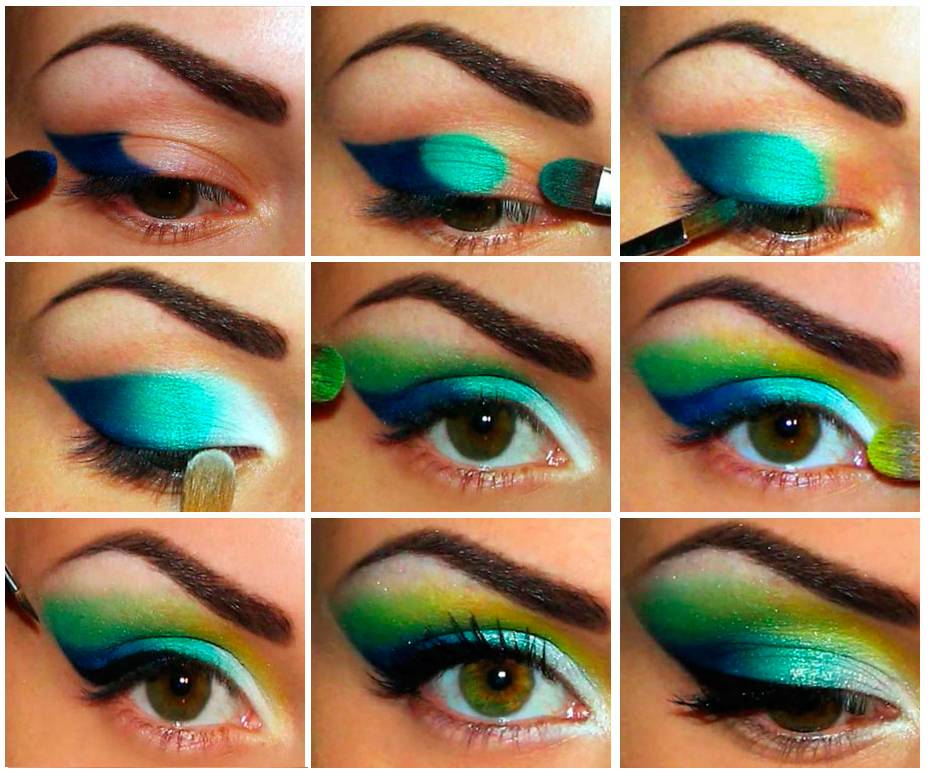 Более темными синими тенями затемняется уголок глаз. Кисть при этом должна двигаться по направлению к концу брови, повторяя наклон нижнего века, как бы продолжая его.
