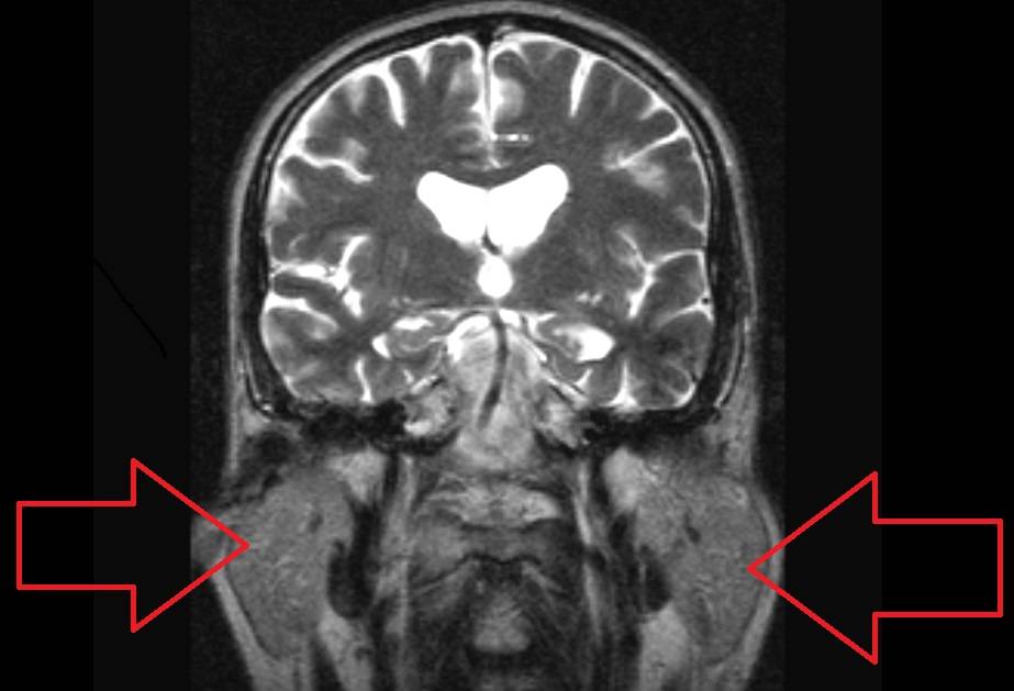 Выраженное воспаление и припухлость слюнных желез у мужчины провоцировало головную боль в области лба и глаз, жжение и зуд в глазах. Болезнь Шегрена не была подтверждена. Улучшение наступило после лечения воспалительного процесса слюнных желез. На МР-томограмах видны увеличенные слюнные железы.