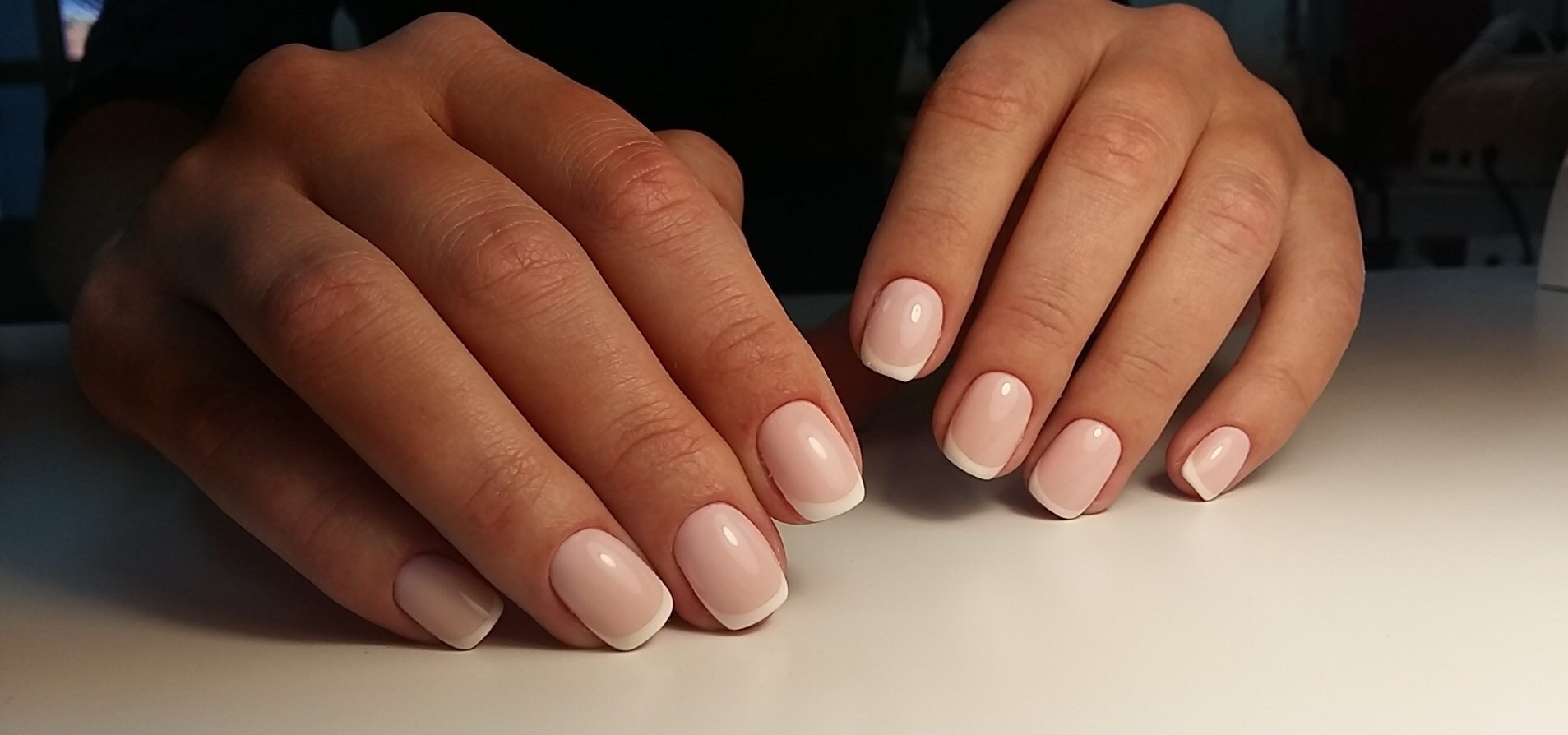 Пример легкого повседневного маникюра, который в 2021-2020 выполняется с использованием цветных гель-лаков или маскирующих баз, которые способны слиться с натуральным цветом кожи. Часто для этого дизайна используют многоугольник (акрил или акриловый гель) для наращивания ногтей. Эти стройматериалы имеют красивые оттенки, приближенные к естественному цвету ногтя.