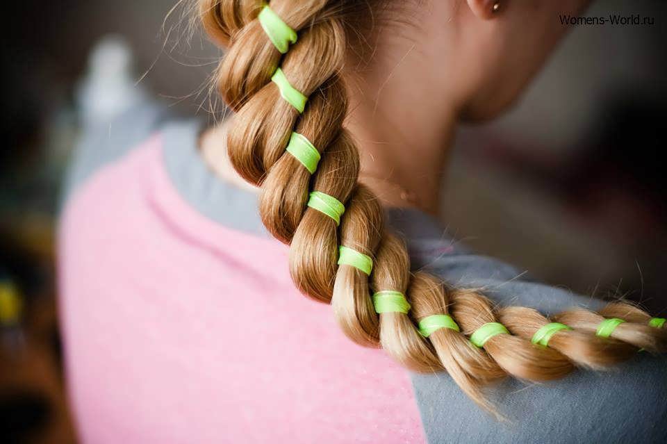 Совет! Для того чтоб процесс перекладывания волосков был более обычным и понятным, и чтоб в их не запутаться, приблизительно на середине длины можно завязать тонкие резинки. Как вы дойдете до их в косе, их просто можно будет стянуть.