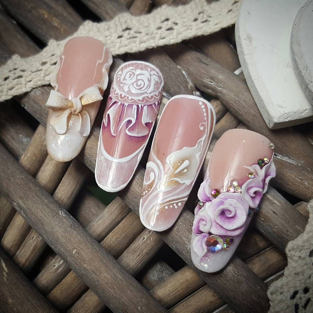 Дизайн ноготков с бантиками может вполне стать завершением свадебного наряда невесты, особенно если использовать при оформлении светлые оттенки лаков или цвета, встречающиеся в общем оформлении свадебной церемонии. Подобными рисунками можно красиво разнообразить френч или украсить однотонные ноготки. Объёмные изображения интересно смотрятся в компании с декором и позволяют создать невероятно шикарные композиции. Также привлекательно выглядят на пальчиках невесты блестящие бантики в виде готовых украшений или узоры, оформленные стразами.