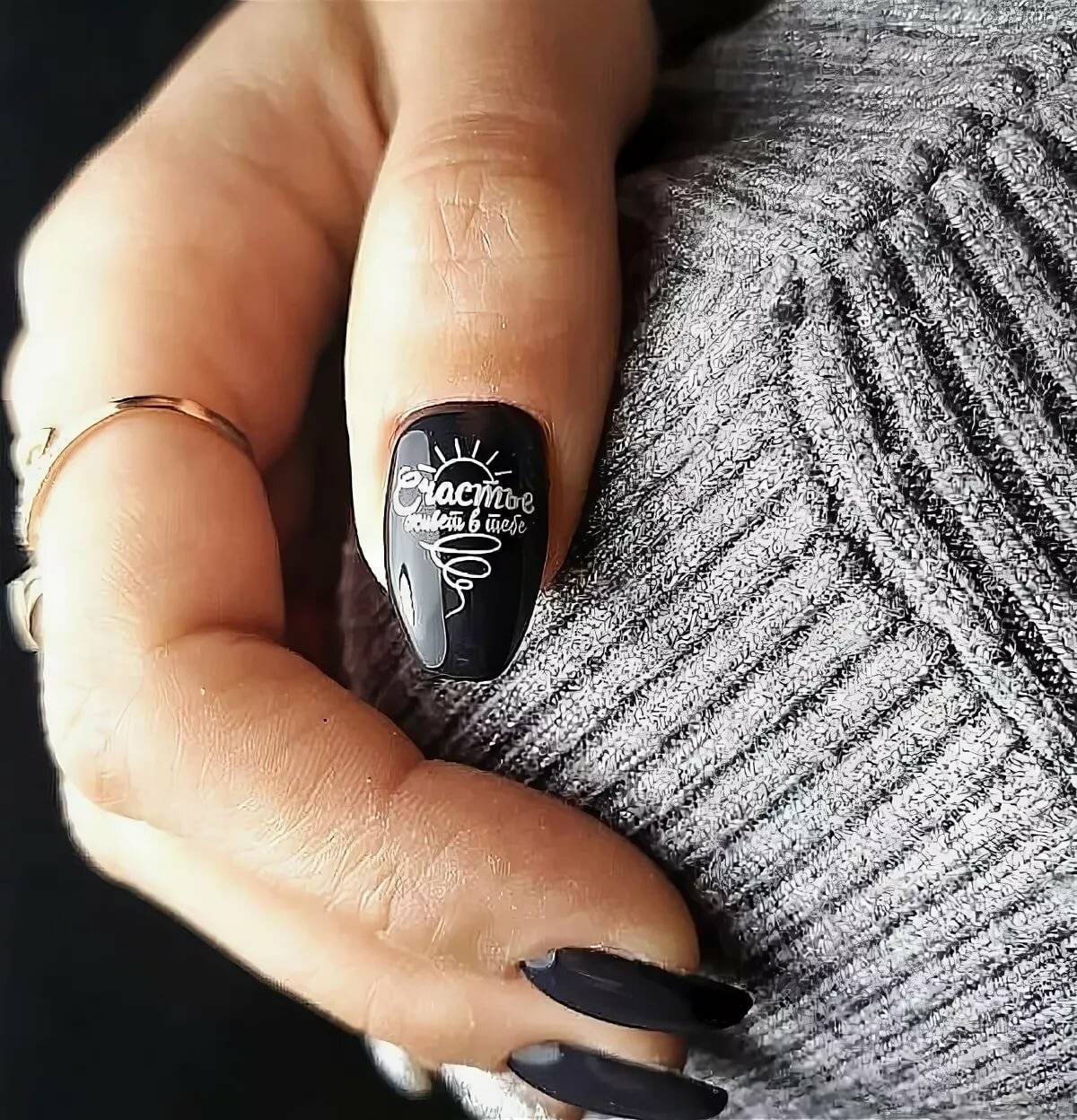 Стильный маникюр с надписями получается как на закругленном квадрате коротких ногтей, так и на длинных ноготках формы миндаль.