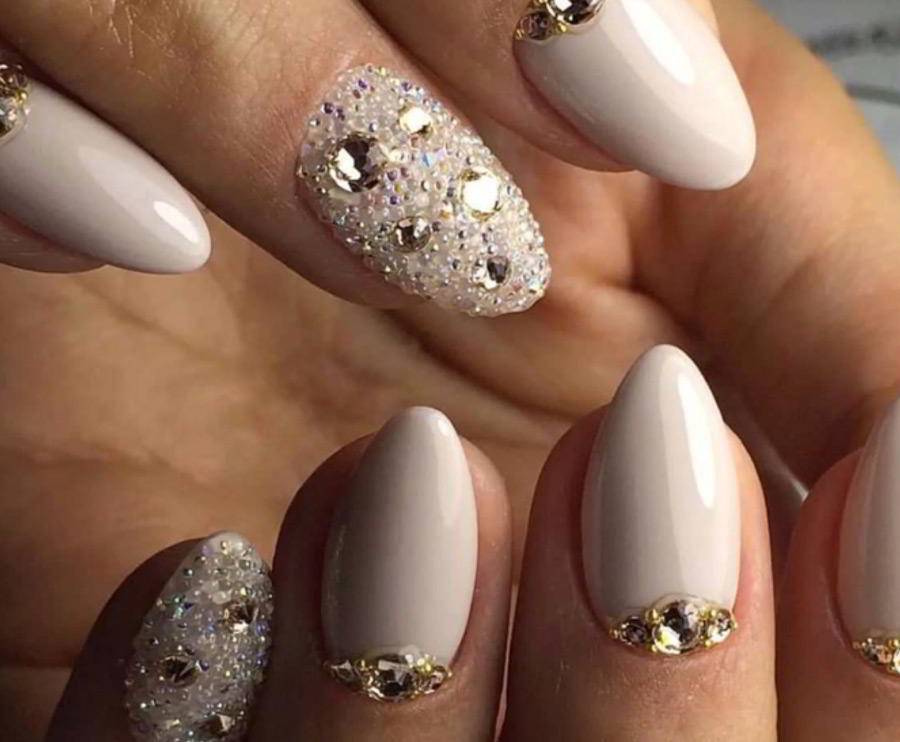 Отличный выбором для невест, которые хотят сиять в буквальном смысле этого слова, станут стразы, блестки, клепки. Некоторые из фотографий свадебного маникюра ниже просто поражают своей роскошью и великолепием, другие притягивают взгляд изящной скромностью. Блестящие камушки лучше всего смотрятся на средних и длинных ногтях, в модных сейчас нюд и пастельных тонах.