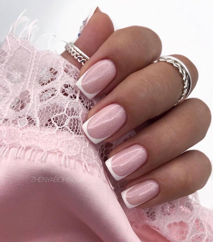Лидирует французский маникюр с жемчужной втиркой, которая придает ногтям благородный блеск и мягкое сияние, напоминающее сверкание жемчуга.