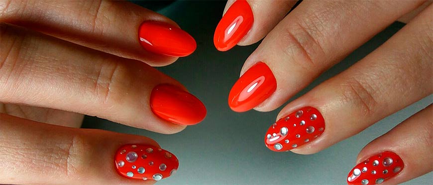 Если вы желаете сделать ваш маникюр более роскошным, то используйте с красным лаком стразы. Маленькие камешки на алых ноготках выглядят очаровательно. Кстати, благодаря прочности гель-лака, стразы не отпадут.
