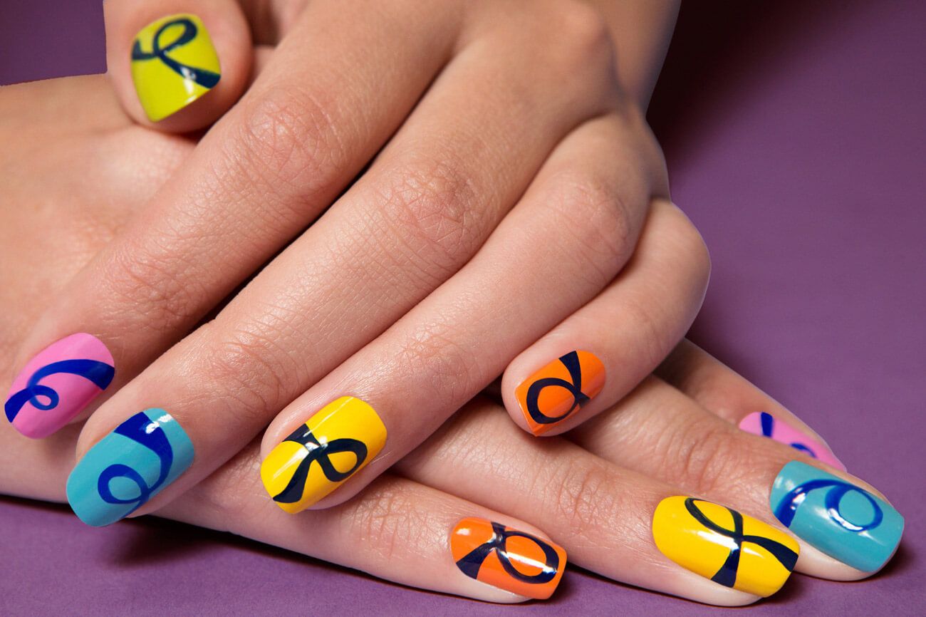 Также можно не ограничиваться одним цветом лака, а выбрать несколько контрастных для создания яркого маникюра.