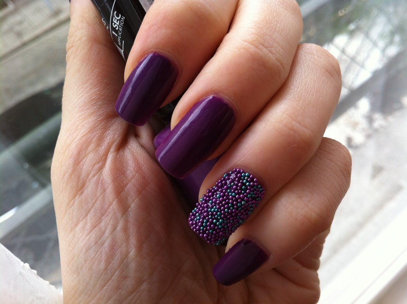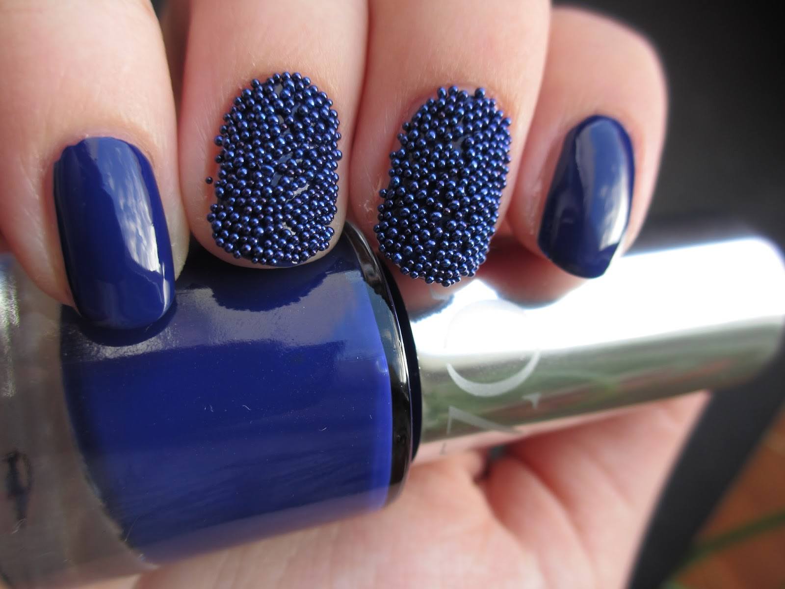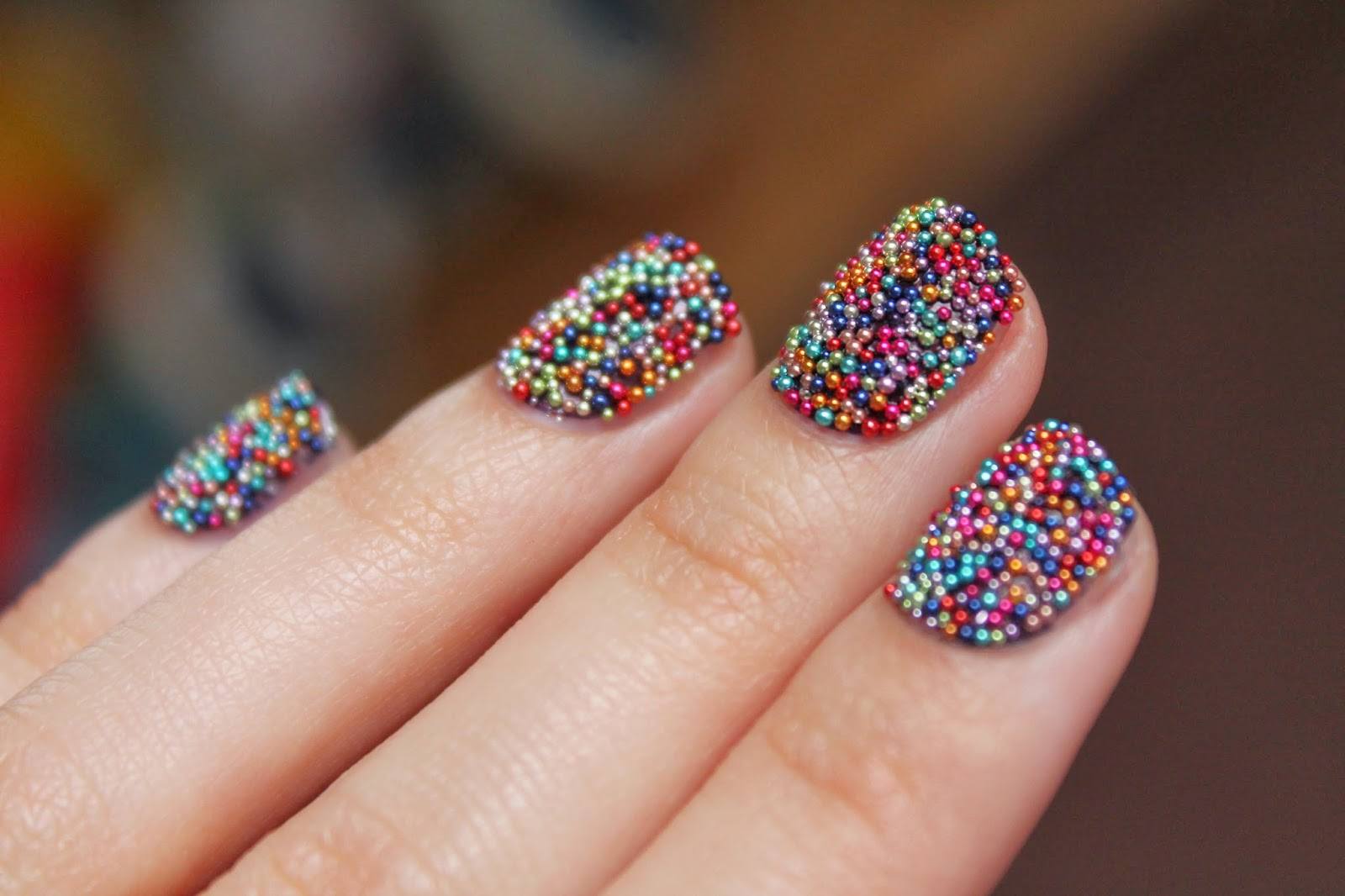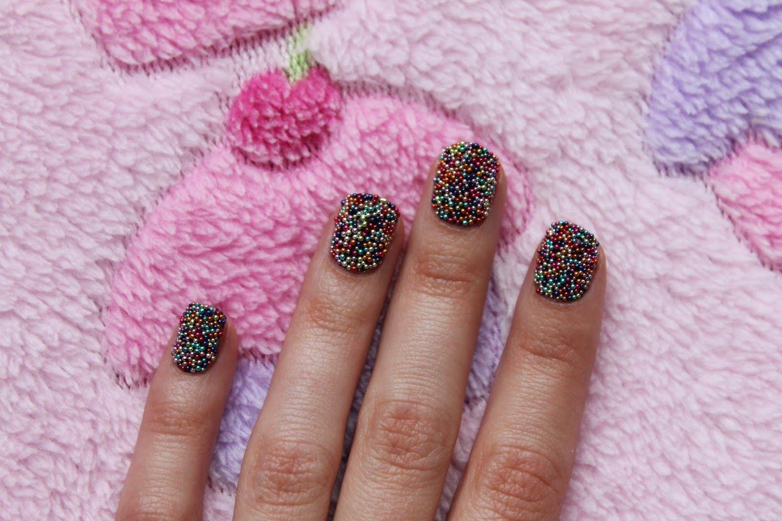 Икорный маникюр без труда можно создать в домашний условиях. Для этого на заранее обработанные ногти наносится базовый лак, желательно в тон микробисеру. На листок бумаги или другую удобную поверхность высыпается небольшое количество бисера