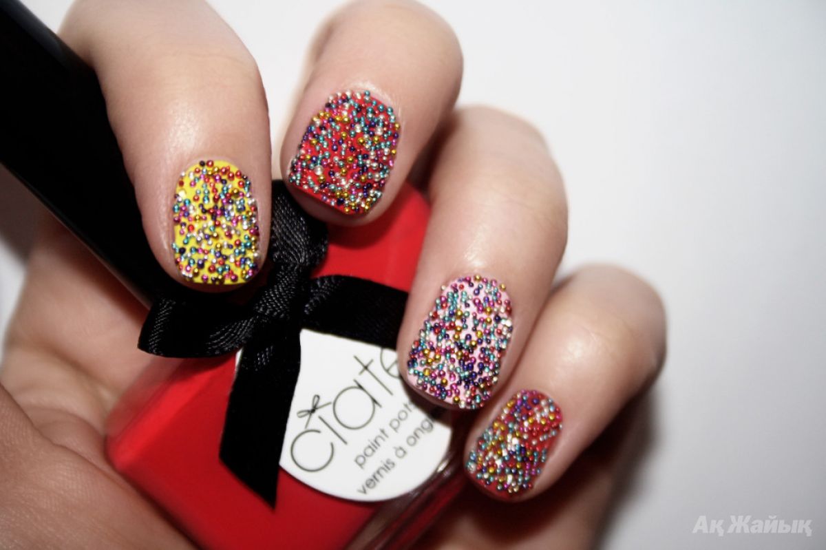 В продаже вы найдете наборы с бисером определенного оттенка, что позволяет создать однотонный икорный маникюр. Но для креативного дизайна потребуется набор с микробисером нескольких оттенков, желательно ярких. К примеру, «солнечный» комплект с оранжевыми, желтыми, бирюзовыми и розовыми цветами.