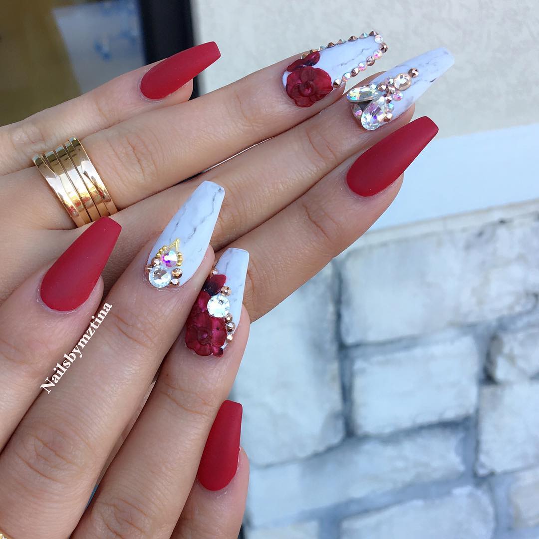Такое предложение, по мнению нейл-дизайнеров, является беспроигрышным вариантом для создания загадочного и богатого оформления. Бархатное красное покрытие, в любом из оттенков, со стразами, смотрится чрезвычайно элегантно и роскошно. Вам остаётся только покрыть ноготки желаемым тоном и украсить один-два пальчика несложным узором. Разнообразные полосы, аккуратные композиции из украшений разного размера и формы, выделение кристаллами основания либо другой части ногтевой пластины – любой из примеров выглядит волшебно. Также приветствуется сочетание в маникюре глянца и матового топа. Это могут быть как отдельно покрытые разными структурами ноготки, так и модный дуэт на одном ногтевом ложе. Границу между ними можно украсить бусинами или мелкими кристаллами.