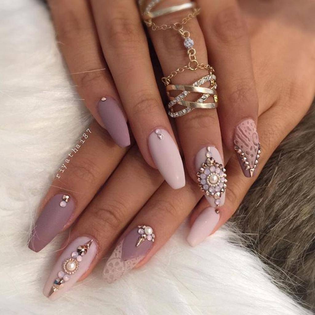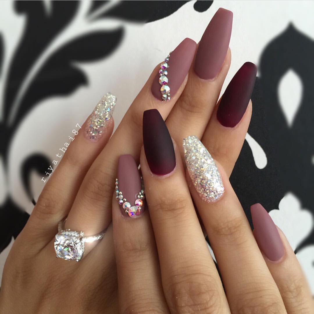 Модные тенденции в последние годы совмещают в себе объединение нескольких текстур – матовых и глянцевых. Комбинация этих двух элементов позволяет творить на ногтях настоящие шедевры. Объем и блеск страз создает невероятную игру света, а на матовом фоне он будет смотреться еще выгоднее.