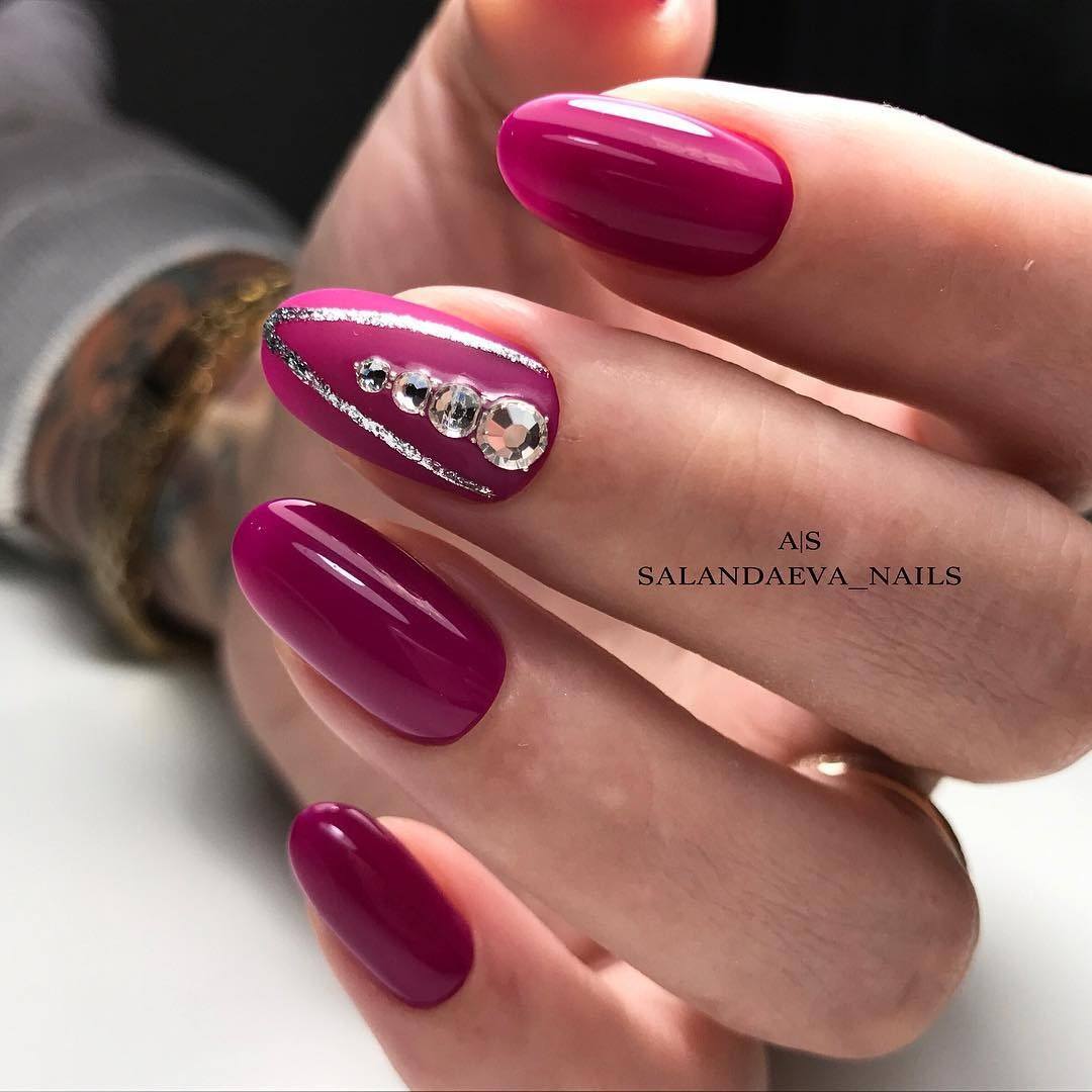 Идеально сочетается с камнями Сваровски. При этом в процессе оформления желательно наносить камешки не на все ноготки, а выделять ими лишь несколько пальчиков на руке.