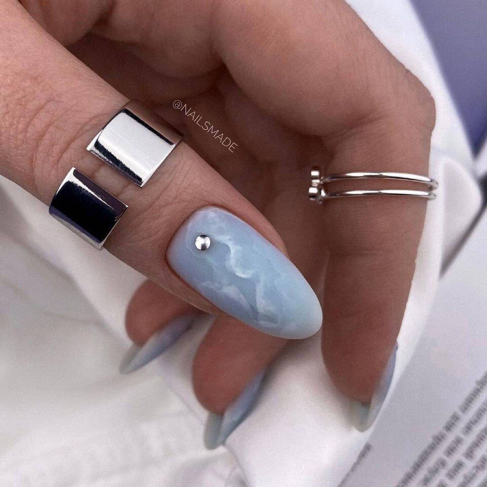При нанесении декоративных элементов на матовую основу старайтесь формировать яркие композиции. Можно оформить только по одному ноготку на каждой руке, но это будет эффектно и стильно.