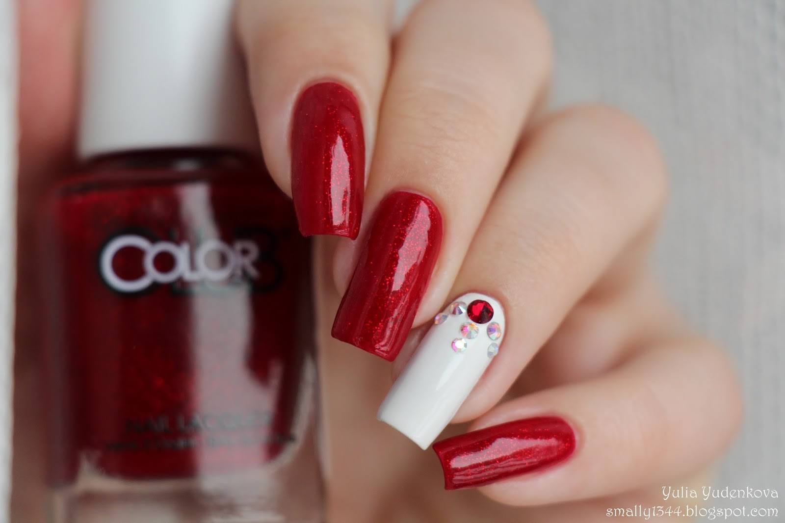 Украшение безымянного пальца красным цветом и стразами