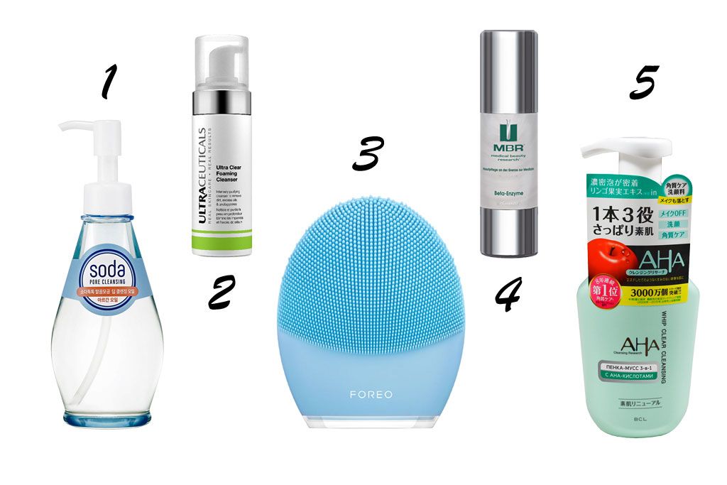 1 – гидрофильное масло для лица Holika Holika, 2 – мягкая пенка для умывания Ultraceuticals, 3 – oчищающая щетка для комбинированной кожи лица Luna 3 от FOREO, 4 – oтшелушивающее средство на базе оксикислот MBR, 5 – пенка-мусс для умывания с фруктовыми кислотами 3-в-1 для нормальной и комбинированной кожи Aha