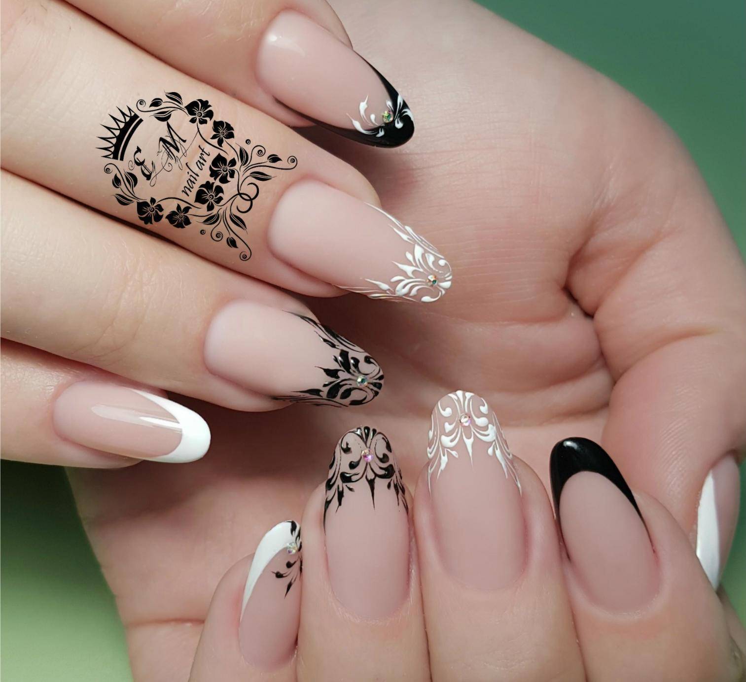 Сделать такой дизайн можно двумя способами: росписью от руки при помощи тонкой кисточки или же при помощи стемпинга. Некоторые приклеивают наклейки, которые имитируют ручную роспись. Особенно эффектно они смотрятся тогда, когда задумывается ажурный френч. В этом случае использование наклеек оправдано и логично.