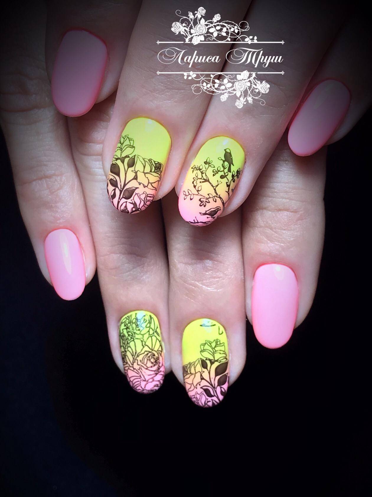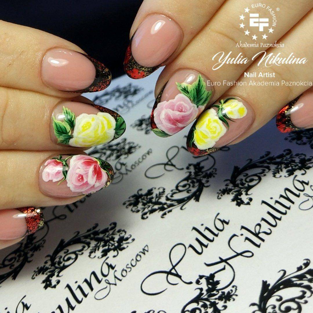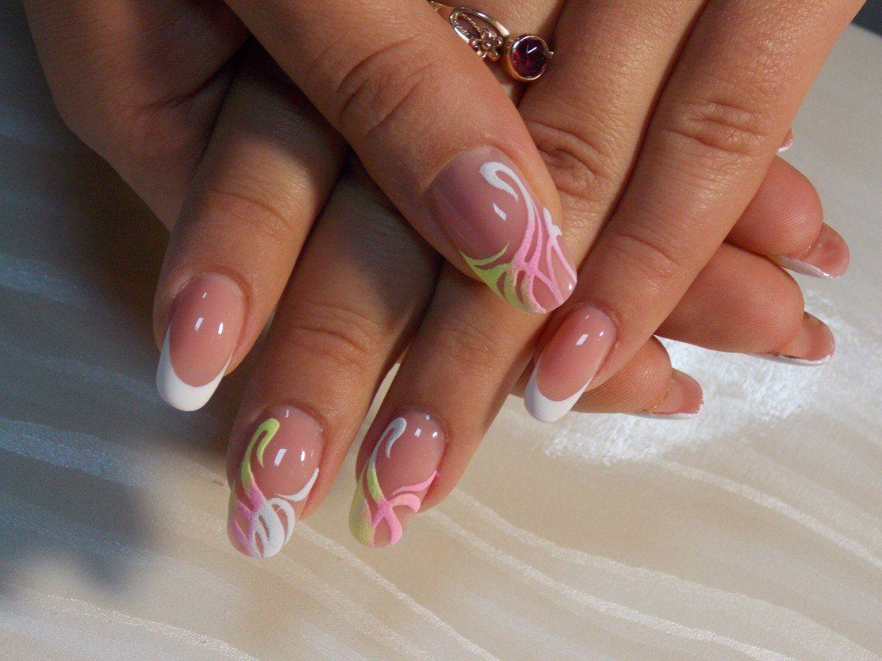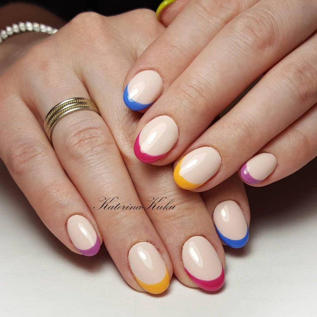 Красочные рисунки предполагают не только контрастные линии, но и цветной переход между ними. Для обозначения линии улыбки и линии дуги, мастера предлагают использовать различные цвета. Учитывая модные тенденции можно отдавать предпочтение оттенкам, выполненным в сезонной гамме. В тёплое время года модно использовать на ногтях цветочные, фруктово-ягодные и различные другие мотивы в ярких исполнениях. Осенью красиво расписывают ногти узорами на осенние мотивы. В зимний период актуальны снежно – новогодние мотивы, сверкающие и блестящие элементы.